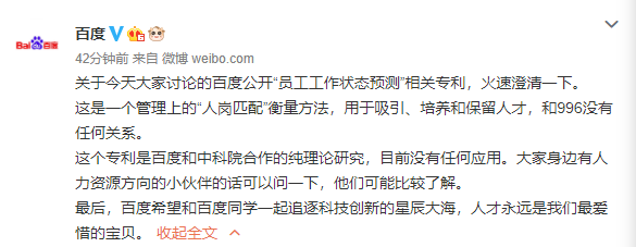 三言财经 1月13日消息,针对网友热议百度公开“员工工作状态预测”相关专利一事,百度在官方微博回应称,这是一个管理上的“人岗匹配”衡量方法,用于吸引、培养和保留人才,和996没有任何关系。百度称,这个专利是百度和中科院合作的纯理论研究,目前没有任何应用。