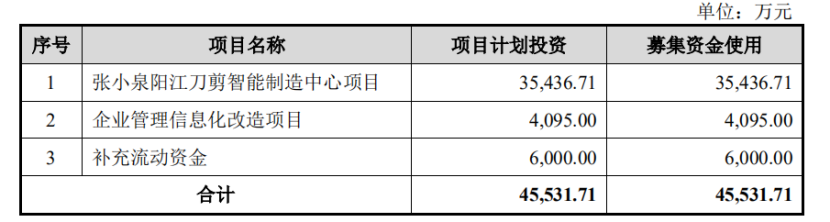 此次上市,张小泉拟募集资金4.55亿元,用于阳江刀剪智能制造中心项目、企业管理信息化改造项目和补充流动资金。