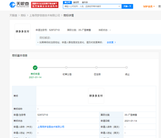 三言财经 1月19日消息,天眼查App显示,1月14日,拼多多关联公司上海寻梦信息技术有限公司新增一项“拼多多支付”商标申请信息,国际分类涉及35-广告销售,商标状态显示为“商标申请中”。