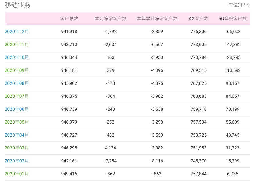 三言财经 1月20日消息,中国移动今日公布2020年12月份运营数据,当月,中国移动移动客户数净减179.2 万户,用户总数达到9.41918亿户。2020年全年,中国移动移动客户数净减835.9万户。