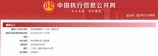 三言财经 1月21日消息,中国执行信息公开网显示,百佳泰信息技术(北京)有限公司新增一条被执行人信息。被执行人详情显示,案件编号:(2021)粤0305执1322号,被执行人为百佳泰信息技术(北京)有限公司,被执行标的100万元,立案时间2021年1月19日,执行法院:深圳市南山区人民法院。