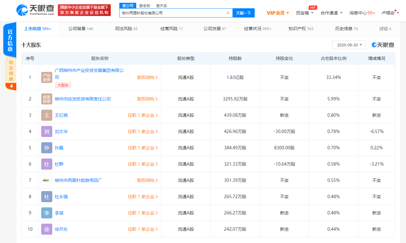 柳州两面针股份有限公司成立于1996年12月,注册资本5.5亿人民币,法定代表人为林钻煌,经营范围主要包括牙膏、发用化妆品、香皂、膏霜、香水类、牙刷、旅游用品、家用卫生品、包装用品等。十大股东信息显示,该公司最大股东为广西柳州市产业投资发展集团有限公司,持股比例为33.34%。