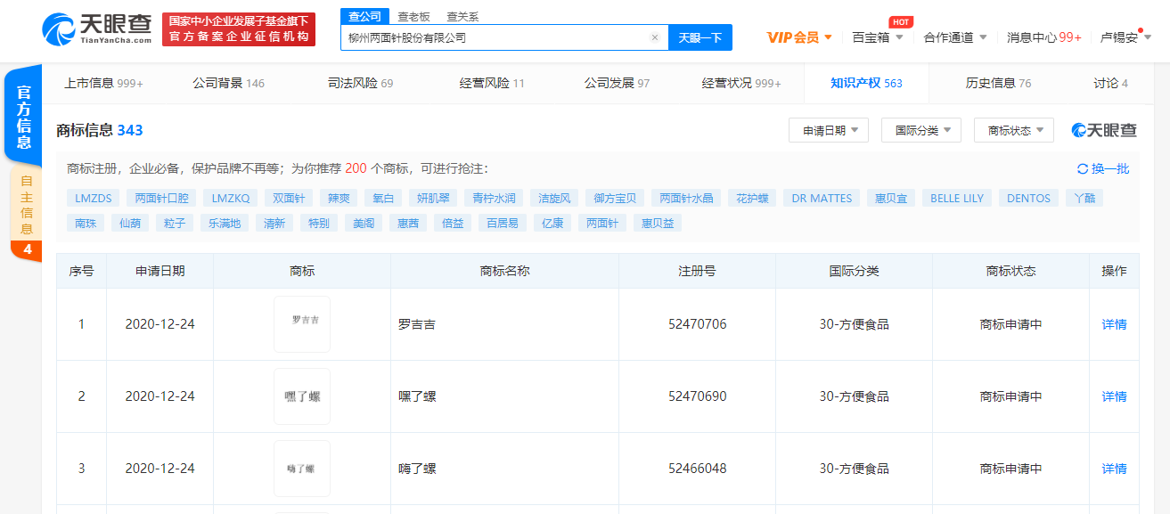 三言财经 1月26日消息,天眼查App显示,柳州两面针股份有限公司于2020年12月申请注册“嗨了螺”、“嘿了螺”商标,国际分类为方便食品,目前商标状态显示为“商标申请中”。