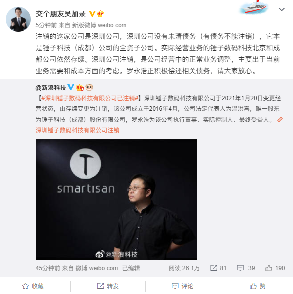 “交个朋友”称,实际经营业务的锤子数码科技有限公司北京和成都公司依然存续。深圳锤子数码科技有限公司注销,是公司经营中的正常业务调整,主要出于当前业务需要和成本方面的考虑。罗永浩正积极偿还相关债务,请大家放心。