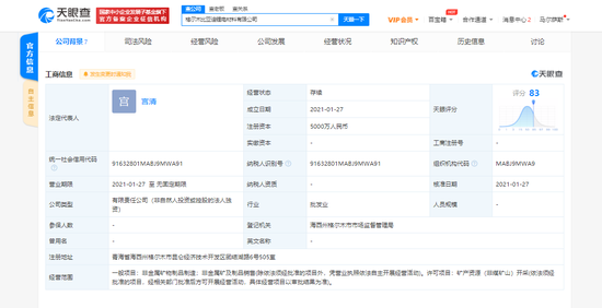 三言财经 1月29日消息,天眼查App显示,1月27日,格尔木比亚迪锂电材料有限公司成立,法定代表人为宫清,注册资本5000万元人民币,经营范围包括非金属矿物制品制造、销售;矿产资源(非煤矿山)开采等,该公司由比亚迪股份有限公司全资持股,疑似实际控制人为王传福。