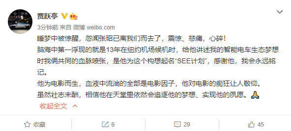 昨日晚间,贾跃亭发文称,“睡梦中被惊醒,忽闻张昭已离我们而去了,震惊、悲痛,心碎!脑海中第一浮现的就是13年在纽约机场候机时,给他讲述我的智能电车生态梦想时我俩共同的血脉喷张,是他为这个构想起名“SEE计划”,感谢他,我会永远铭记。他为电影而生,血液中流淌的全部是电影因子,他对电影的痴狂让人敬仰。虽然壮志未酬,相信他在天堂里依然会追逐他的梦想、实现他的夙愿。”