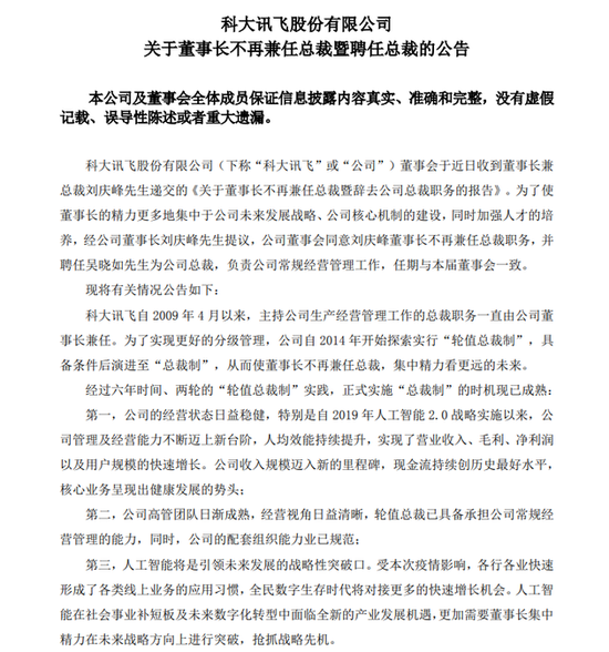 三言财经 2月7日消息,科大讯飞发布公告称,董事会同意董事长刘庆峰不再兼任总裁职务,并聘任吴晓如为总裁,负责公司常规经营管理工作。刘庆峰的精力更多地集中于公司未来发展战略、核心机制的建设。