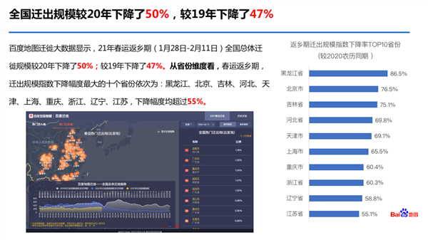 三言财经 2月14日消息,据百度地图迁徙大数据显示(1月28日-2月11日),今年春运返乡期全国总体迁徙规模大幅下降,迁徙规模指数较去年下降50%,较2019年下降47%。