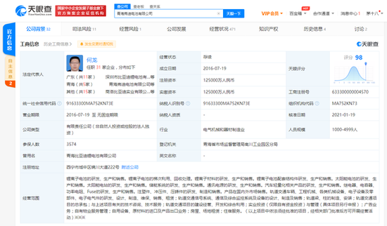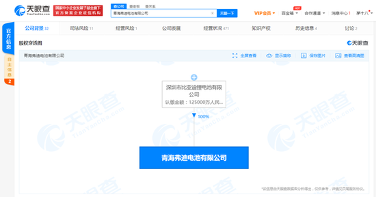 天眼查App显示,青海弗迪电池有限公司成立于2016年7月,注册资本12.5亿人民币,法定代表人为何龙,经营范围包括锂离子电池的研发、生产和销售。锂离子电池的梯次利用、回收处理。锂离子电池配套结构件研发、生产和销售。太阳能电池的研发、生产和销售等。股权穿透图显示,该公司由深圳市比亚迪锂电池有限公司100%持股。