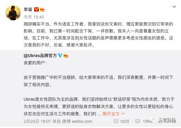 李诞表示,自己作为语言工作者,当拿到这份文案时,理应更能意识到它带来的影响。“我本人一向是尊重女性的立场,在工作中,尤其是涉及到女性话题的发声需要更多考虑女性朋友的感受。这次是我的不好,反省,感谢大家批评”。