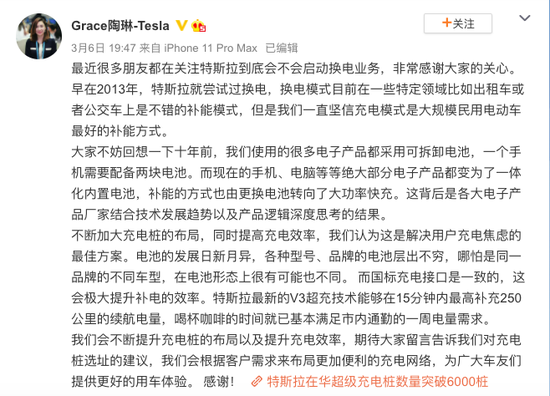 三言财经 3月7日消息,近日,特斯拉(上海)有限公司经营范围新增 “新能源汽车换电设施销售”等项目,这意味着特斯拉在中国市场已经有资格为自家车型推出换电服务选装包。之后,特斯拉相关负责人否认做换电业务。 特斯拉对外事务副总裁陶琳对 “特斯拉到底会不会启动换电业务”进行了回应,称坚信充电模式是大规模民用电动车最好的补能方式。