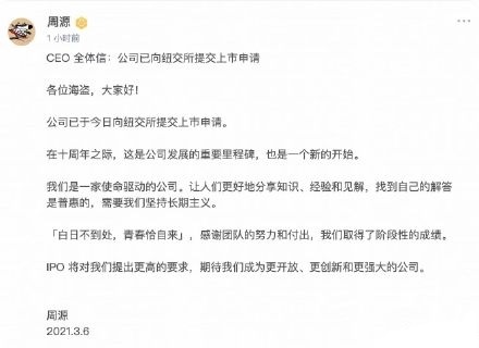 三言财经 3月7日消息,知乎创始人、CEO周源昨日在知乎内网社区发布CEO全体信。信中提到,公司已向纽交所提交上市申请,在十周年之际,这是公司发展的重要里程碑,也是一个新的开始。
