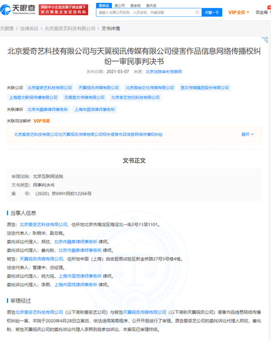 三言财经 3月8日消息,天眼查App显示,3月7日,北京爱奇艺科技有限公司与天翼视讯传媒有限公司侵害作品信息网络传播权纠纷一审民事判决书公开。案号为(2020)京0491民初12266号,原告为北京爱奇艺科技有限公司,被告为天翼视讯传媒有限公司。