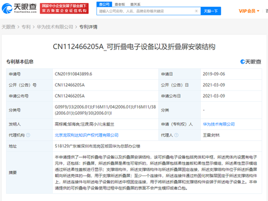 三言财经 3月10日消息,天眼查App显示,3月9日,华为技术有限公司公开一项名称为“可折叠电子设备以及折叠屏安装结构”的专利,专利公开号为CN112466205A,申请日期为2019年9月6日。