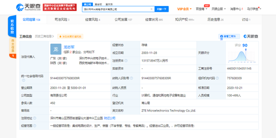 天眼查工商信息显示,深圳市中兴微电子技术有限公司成立于2003年11月,法定代表人为龙志军,注册资本约为1.3亿人民币,经营范围包括集成电路的设计、生产、经营进出口业务等。据股东信息显示,该公司包括中兴通讯股份有限公司、深圳市汇通融信投资有限公司等。