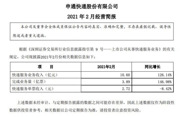 三言财经 3月19日消息,申通快递对外发布公告称,2月快递服务业务收入10.6亿元,同比增长126.14%;完成业务量3.89亿票,同比增长146.98%。2月份,申通快递服务单票收入为2.72元,同比下降8.42%。