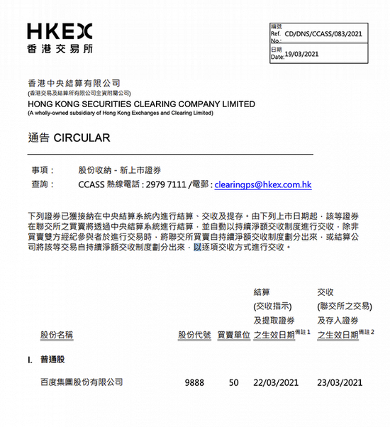 三言财经 3月19日消息,港交所表示,百度已获接纳在中央结算系统内进行结算、交收及提存。