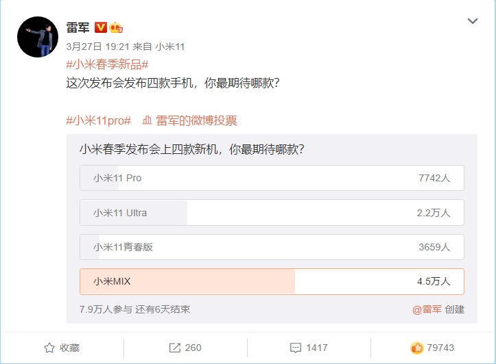 三言财经 3月28日消息,雷军昨晚微博确认,本次春季新品发布会将带来四款智能手机新品,分别是小米11 Pro、小米11 Ultra、小米MIX 、小米 11青春版。微博投票显示,小米MIX 新品最受期待。