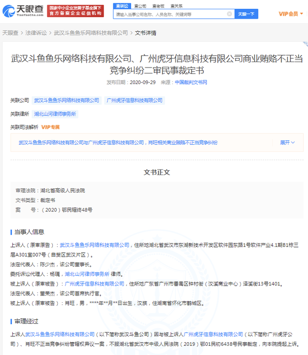 2020年9月,该案件二审民事裁定书公开。该裁定书显示,武汉斗鱼公司上诉称,本案系因广州虎牙公司对武汉斗鱼公司签约的主播肖旺进行恶意挖角所致的不正当竞争纠纷。广州虎牙公司的行为导致武汉斗鱼公司经营的斗鱼直播平台对主播的巨额投入损失、流量及观众流失,损害了上诉人的市场竞争优势,商誉、商业利益、经济利益等合法权益,以及网络直播网站行业的正常经营秩序。武汉斗鱼公司不服湖北省武汉市中级人民法院(2019)鄂01民初6438号民事裁定,向本院提起上诉,诉称根据相关规定,其有权向被告住所地或者侵权行为地人民法院(湖北省武汉市中级人民法院)起诉。