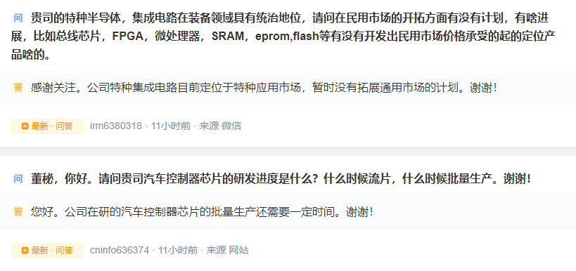 三言财经 4月18日消息,紫光国微在互动平台表示,公司在研的汽车控制器芯片的批量生产还需要一定时间。此外,紫光还表示他们的特种集成电路目前定位于特种应用市场,暂时没有拓展通用市场的计划。