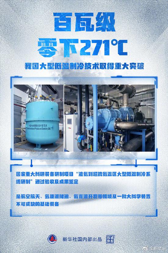 三言财经4月19日消息,据新华社消息,近日,国家重大科研装备研制项目“液氦到超流氦温区大型低温制冷系统研制”通过验收及成果鉴定,标志着我国具备了研制液氦温度(零下269摄氏度)千瓦级和超流氦温度(零下271摄氏度)百瓦级大型低温制冷装备的能力。