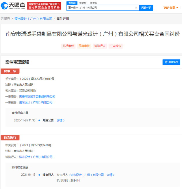 三言财经 4月19日消息,天眼查App显示,近日,诺米设计(广州)有限公司被南安市人民法院列为被执行人,执行标的285444元,案号为(2021)闽0583执2488号,案由为南安市瑞诚手袋制品有限公司与诺米设计(广州)有限公司买卖合同纠纷。