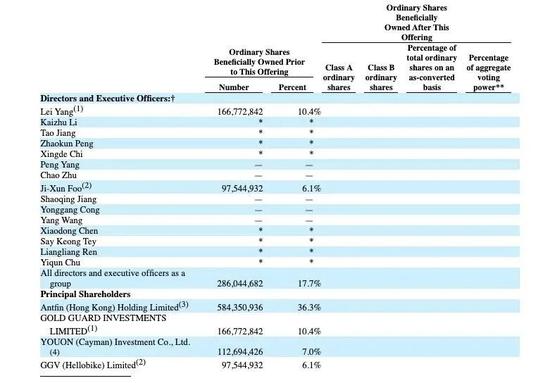 根据招股书披露,蚂蚁集团间接全资附属公司Antfin (Hong Kong) Holding Limited持股比例为36.3%,是第一大股东。投资人符绩勋持股6.1%,管理层合计持股17.7%,哈啰出行创始人杨磊仅持股10.4%,共享单车公司永安行持股7%,GGV持股6.1%,永安行旗下的全资子公司YOUON (Cayman) Investment持有7%的股份,其他联合创始人或股东持股均小于1%。