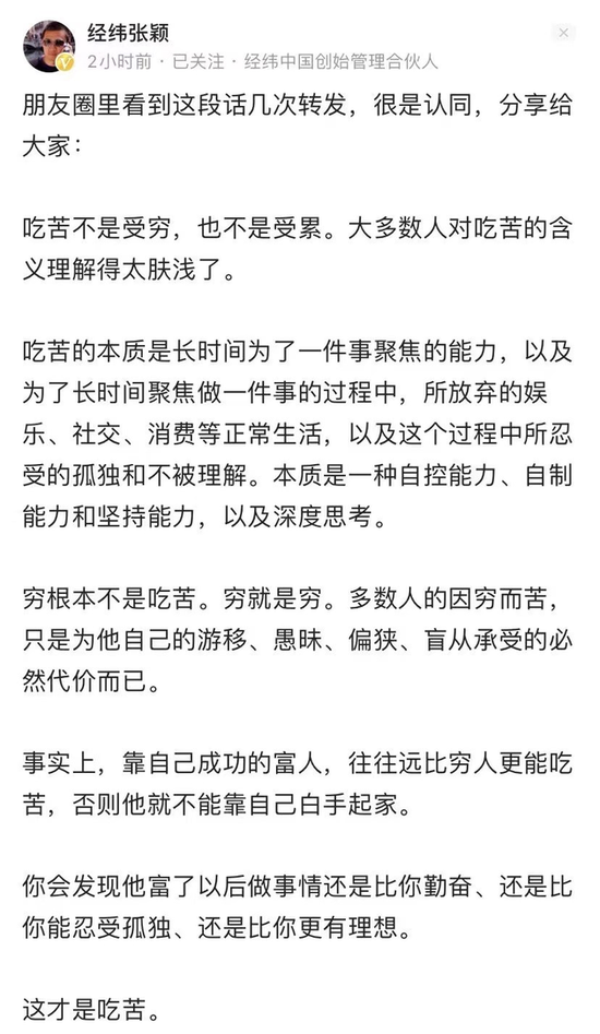 对此,经纬中国品牌负责人表示,张颖是在朋友圈看到而转发,并非自己原创。张颖已经反思,希望外界不要过度解读,社交媒体内容是对“吃苦”的看法,而不是“穷”。