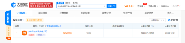 三言财经5月8日消息,天眼查App显示,5月7日,小米私募股权基金管理有限公司成立,注册资本1亿元,法定代表人为林世伟,经营范围含私募股权投资基金管理、创业投资基金管理服务等。股东信息显示,该公司由小米科技有限责任公司全资持股,疑似实际控制人为雷军。