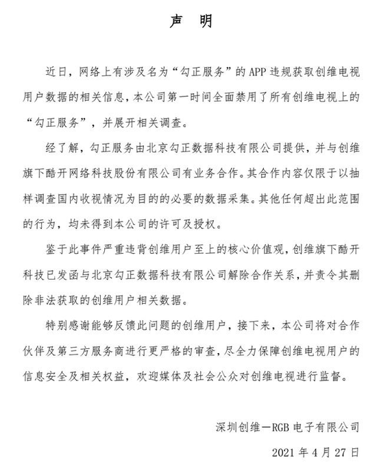 近日,创维官方发布公告回应,创维旗下酷开网络使用“勾正服务”仅采集必要数据,其他任何超出范围的行为未得到公司许可及授权。官方已第一时间全面禁用了电视上的“勾正服务”,与北京勾正数据科技有限公司解除合作关系,并责令其删除非法获取的创维用户相关数据。