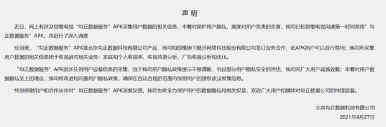 勾正数据也做出回应称,该公司所采集用户数据的相关信息用于收视研究相关业务:家庭和个人收视率、收视效果分析、广告收视分析和优化,用户可自行禁用 APK。