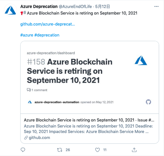 三言财经5月14日消息,5月12日,微软宣布将于2021年9月10日关闭其Azure区块链服务。
