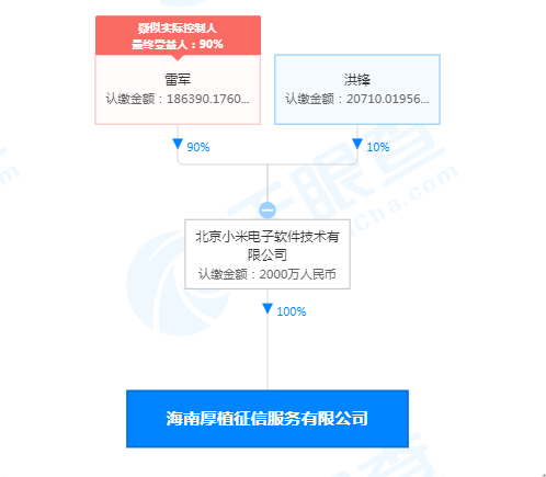 股权穿透图显示,该公司由北京小米电子软件技术有限公司全资控股,疑似实际控制人为雷军。