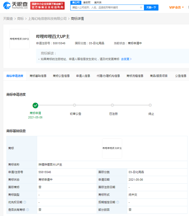 三言财经5月14日消息,天眼查App显示,近日,哔哩哔哩关联公司上海幻电信息科技有限公司申请注册“百大UP主”“哔哩哔哩百大UP主”“百大UP主颁奖”等商标,国际分类现涉及啤酒饮料、科学仪器、日化用品等,目前商标状态为“商标申请中”。