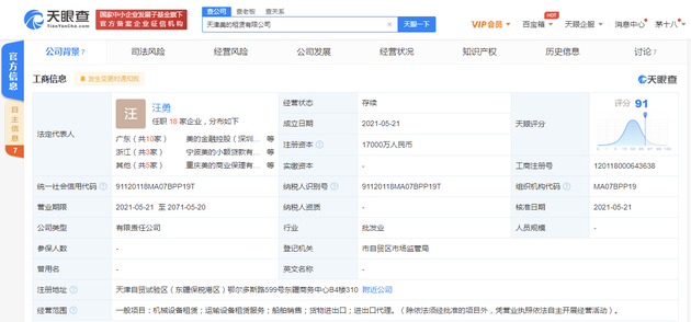 三言财经5月24日消息,天眼查App显示,近日,天津美的租赁有限公司成立,注册资本1.7亿人民币,法定代表人为汪勇,经营范围为机械设备租赁;运输设备租赁服务;船舶销售;货物进出口;进出口代理。