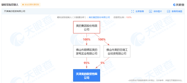 股权穿透信息显示,该公司由佛山市顺德区美的家电实业有限公司与佛山市美的空调工业投资有限公司合资成立,持股比例分别为95%、5%,疑似实际控制人为美的集团股份有限公司。