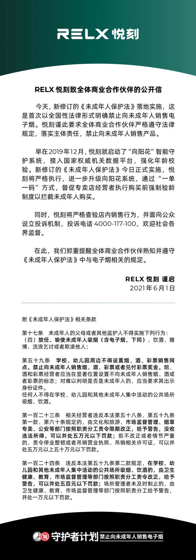公开信中表示,早在2019年12月,悦刻就启动了“向阳花”智能守护系统,接入国家权威机关数据平台,强化年龄校验。新修订的《未成年人保护法》今日正式实施,悦刻将严格执行,进一步升级向阳花系统,通过“一单一码”方式,督促专卖店经营者执行购买前强制验龄制度以拦截未成年人购买。