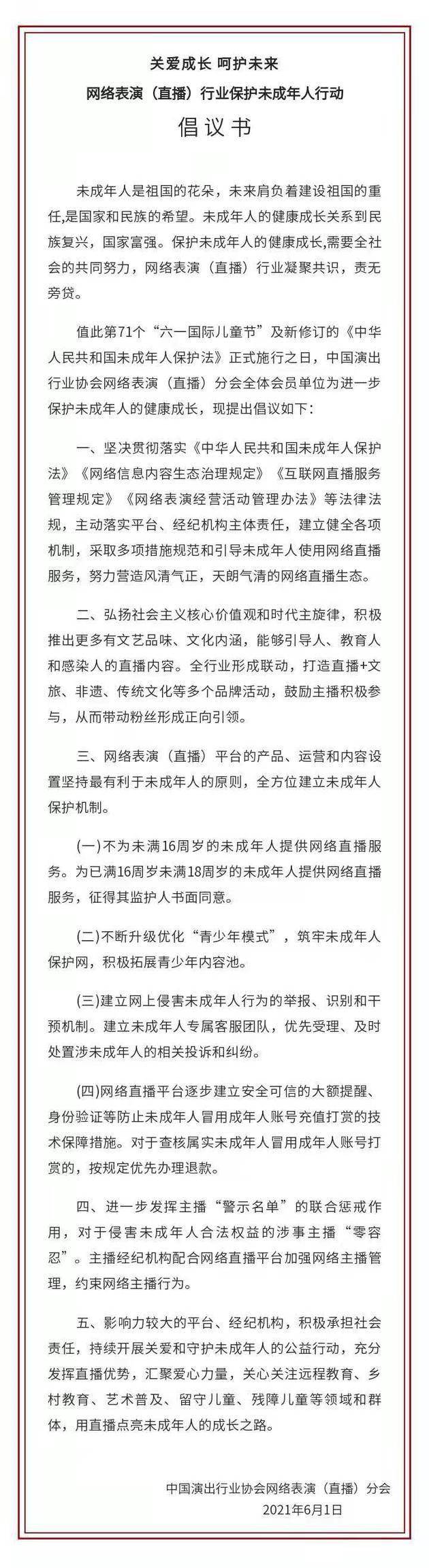 三言财经6月1日消息,今日,中国演出行业协会网络表演(直播)分会发布《网络表扬(直播)行业保护未成年人行动倡议书》。