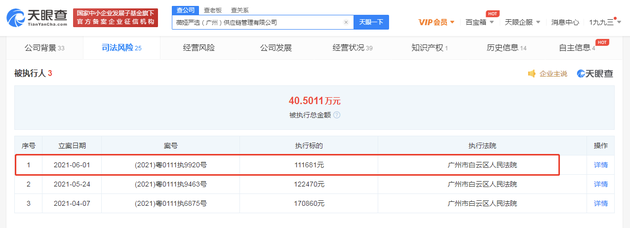 三言财经6月2日消息,天眼查App显示,6月1日,薇娅严选(广州)供应链管理有限公司新增一则被执行人信息,案号(2021)粤0111执9920号,执行标的111681元,执行法院为广州市白云区人民法院。