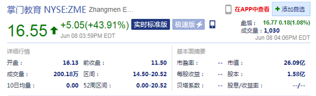 三言财经 6月9日消息,掌门教育正式在美上市,上市首日掌门教育开盘价17.74美元每股,较发行价上涨54.26%。截至收盘,掌门教育收涨43.91%,报16.55美元,市值超26亿美元。