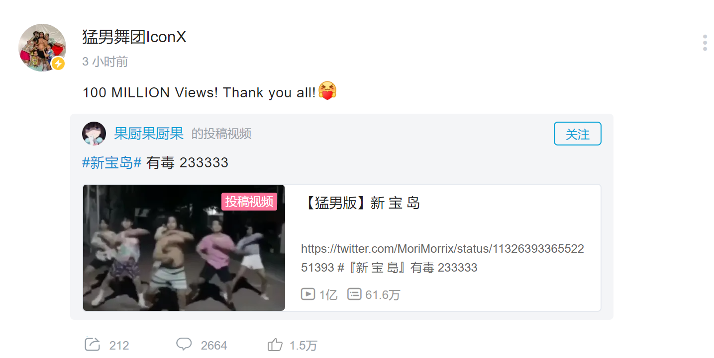 《【猛男版】新宝岛》视频在转载至B站后,一度风靡舞蹈区。B站也涌现出各种各样的翻跳版本。此后“猛男舞团IconX”顺利入驻B站,至今已收获186万粉丝与1亿播放数。