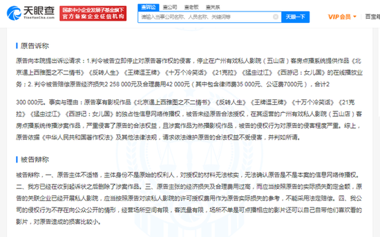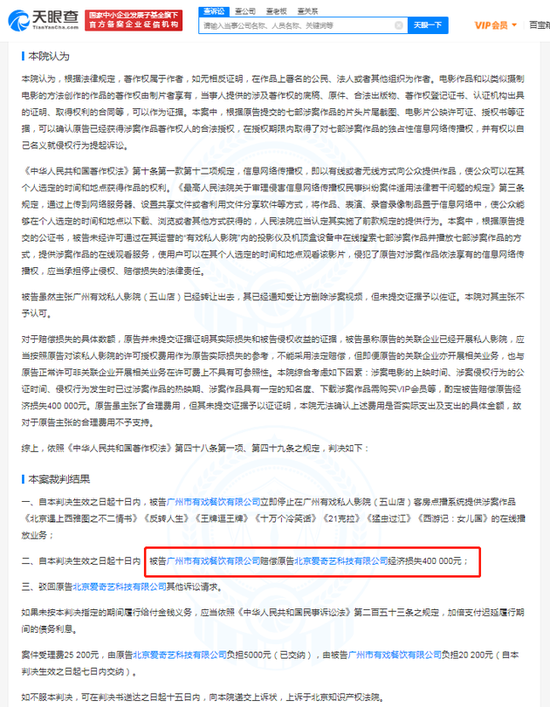 判决书显示,被告广州市有戏餐饮有限公司未经原告北京爱奇艺科技有限公司合法授权,在其运营的广州有戏私人影院客房点播系统传播涉案作品,包括《北京遇上西雅图之不二情书》《王牌逗王牌》《十万个冷笑话》《猛虫过江》《西游记:女儿国》等,侵害了原告的合法权益。原告请求法院判令被告赔偿损失共230万元。