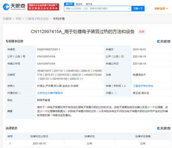 三言财经6月18日消息,天眼查App显示,6月18日,三星电子株式会社公开“用于处理电子装置过热的方法和设备”发明专利,公开号CN112997415A,申请日期2019年10月。