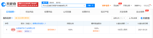 三言财经 6月24日消息,天眼查App显示,近日,天水比亚迪乾元新景汽车销售有限公司成立,法定代表人为王保国,注册资本100万人民币,经营范围包括汽车新车销售;汽车零配件零售;二手车经纪;二手车鉴定评估;汽车装饰用品销售等。股东信息显示,该公司由比亚迪汽车工业有限公司全资持股。