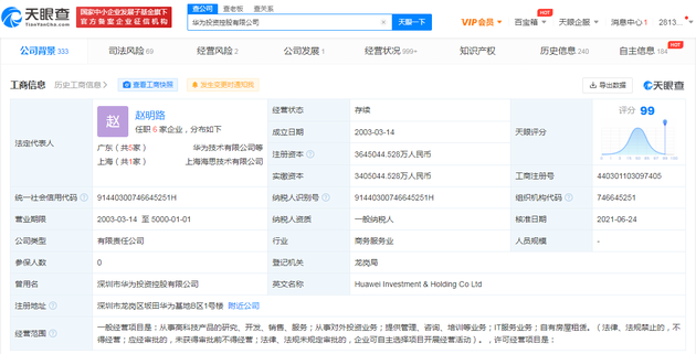 华为投资控股有限公司成立于2003年3月,法定代表人为赵明路,经营范围含从事高科技产品的研究、开发、销售、服务;从事对外投资业务等。