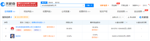 股东信息显示,该公司由华为投资控股有限公司工会委员会和任正非共同持股。