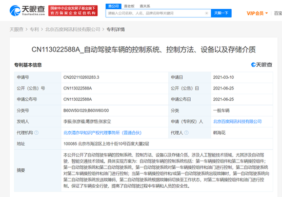 三言财经6月28日消息,天眼查App显示,近日,北京百度网讯科技有限公司公开“自动驾驶车辆的控制系统、控制方法、设备以及存储介质”专利,公开号CN113022588A,申请日期为2021年3月。