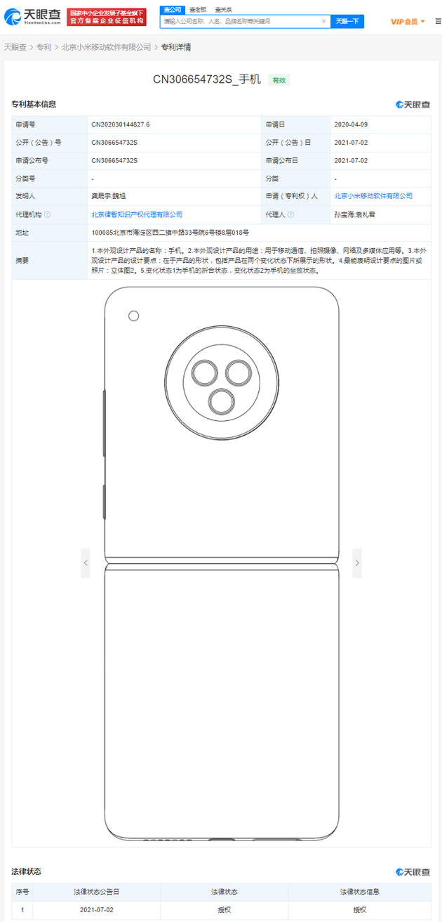 三言财经7月5日消息,据天眼查App显示,近日,北京小米移动软件有限公司获得“手机”外观专利授权,公告号CN306654732S,申请日期为2020年4月。专利摘要显示,本外观设计产品用于移动通信、拍照摄像、网络及多媒体应用等。本外观设计产品的设计要点:在于产品的形状,包括产品在两个变化状态下所展示的形状。