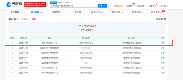 三言财经 7月6日消息,天眼查App显示,北京汇源饮料食品集团有限公司新增一条被执行人信息,案号(2021)京04执314号,执行标的超15.9亿元,执行法院为北京市第四中级人民法院。