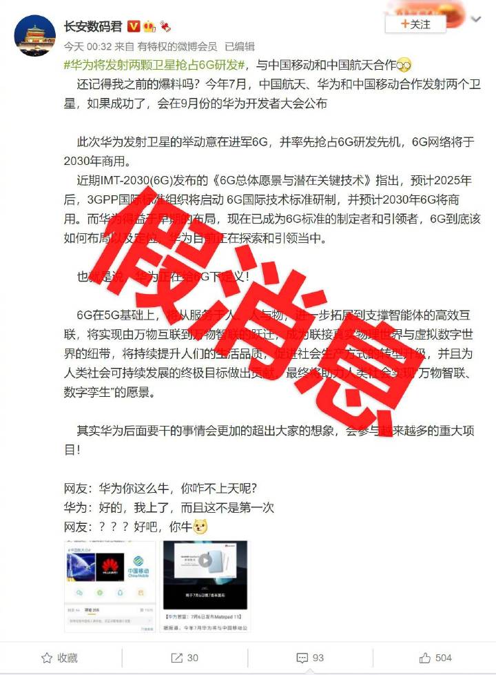 三言财经 7月6日消息,日前,有消息称,华为将与中国移动公司、中国航天公司合作发射两颗卫星,此次华为发射卫星的举动意在进军6G,并率先抢占6G研发先机。对此消息,华为通过官方微博作出回应:假消息。